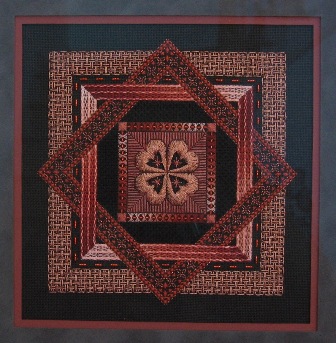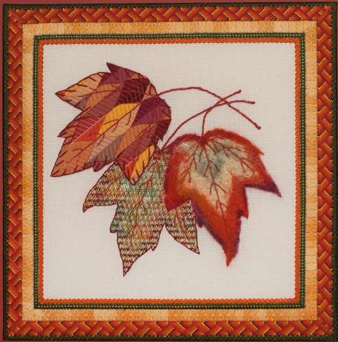 Maple leaves are done 3 ways in this intermediate level design. Leaf 1 is padded appliquéd fabric (choices). Leaf 2 is a shaded laid filling pattern. Leaf 3 is needle felted with wool roving. Stems & veins are embroidered on top of each leaf. The 5 border frame is stitched in several different stitches picking up the colors in the leaves. The 10” x 10” design it is on eggshell Congress cloth and includes, Painters Threads Overdyed Floss, Planet Earth Silk Veggies, DMC & Anchor floss, Rainbow Gallery Sparkle! Braid and Splendor silk, and Soy Luster Shadows. This is a 2-day class