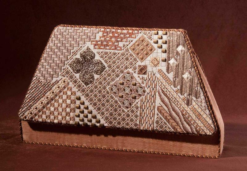 Bronze Purse Bronze, brass, & copper highlight this stunning purse flap. You will explore many separate motifs in this piece. A beautiful brass filigreed clover leaf creates the focal point of the flap, while the combination of metallic and silk threads crafts the areas that will enhance the clover leaf. The threads look beautiful on the Soft Mocha Congress cloth and include Silk Lamé Braid, Sparkle! Braid, Kreinik metallic braid, Accentuate, Bijoux, Overdyed metallic thread by ThreadworX, Impressions & Needlepoint Inc. silk, along with beautiful square Tila Beads by Miyuki. This intermediate level design is approximately 6” x 12”. Each student will receive the unique lining material to finish their flap which has purse patterns covering the fabric. This is a 2-day class.