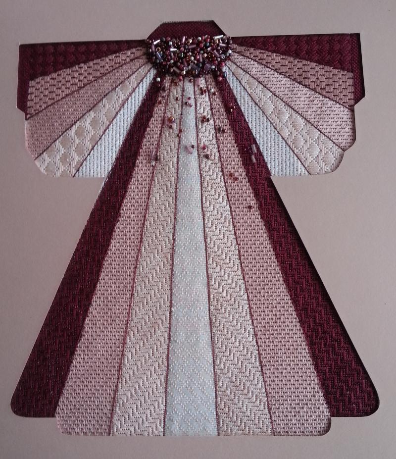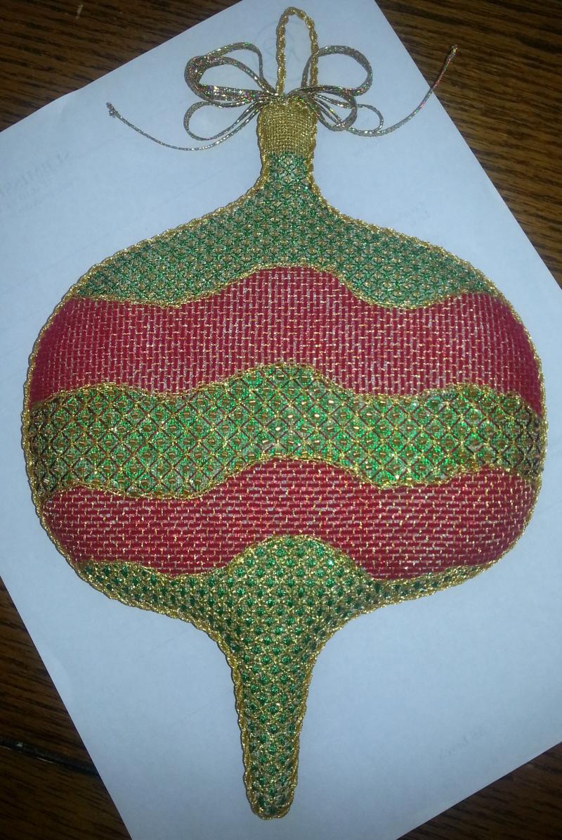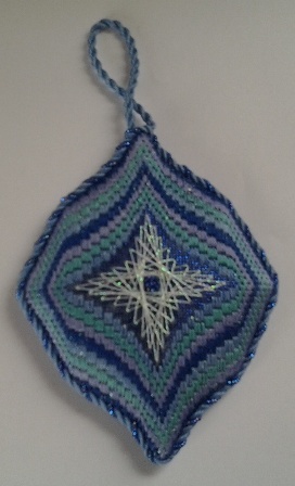 Leah Ornament Do you appreciate the antique glass Christmas ornaments of old. The Leah Ornament is based on those glass ornaments, but is not breakable. This one day intermediate level class on light blue congress cloth uses cotton & silk flosses along with a couple of sparkly threads and rich glass beads to create a beautiful, rich gemstone colored design of blue, green, & violet. You will learn an interesting “Hot Foil Technique” using a deep metallic blue, which will be applied before stitching begins. The finished ornament with its graceful curves is approximately 5” x 4” and will look beautiful hanging anywhere you choose. Your kit will include all threads, the wonderful foil and applicator, along with everything you need to create a wonderful heirloom ornament. This is a 1-day class.