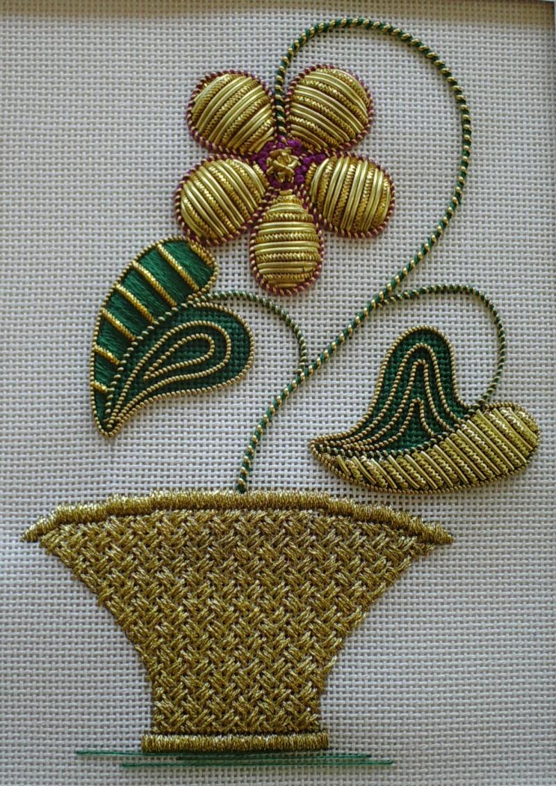 Golden Petals, a small piece, approximately 4” x 6”, focuses in on one small flower, but creates a beautiful design with the use of goldwork petals and leaves. The petals and stems use a technique of wrapping silk thread in the grooves of the gold to finish with a two-color effect. The basket is stitched with a woven stitch and metallic thread to create the look of an elegant real basket. The top and bottom of the basket finish off the piece with a nice edge. Design size: 4” x 6”. This is a 2-day class.