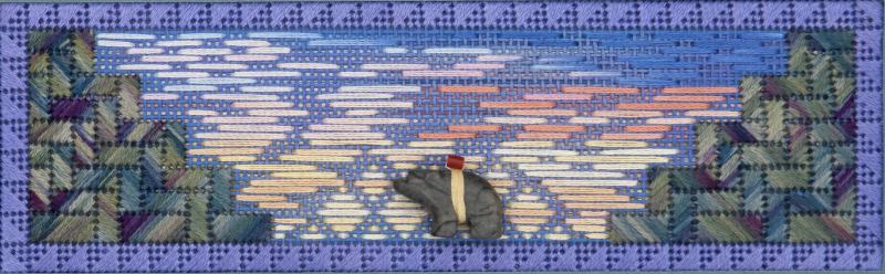 Zuni Sunset is a small, but precious piece of needleart. The design represents the earth, sun, and mountains. The addition of the small turquoise bear fetish makes the piece special and, since the bear fetish is a symbol of health, strength, introspection, and power for the soul, will be a protector for the recipient of this piece. In this 6-hour class using wool, silk, cotton, and Sea Grass threads, you will make Zuni Sunset come alive with color. During the class, the student will receive a small history lesson on Zuni Fetishes and the tribes beliefs revolving around these fetishes, learn several fun stitches, and learn how to attach a small object to canvas. This is a 1-day class.
