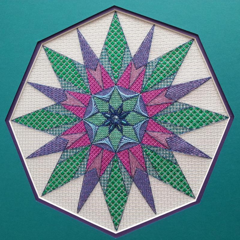 Jewel sparkles like a beautiful gemstone combining greens, blues & lavenders in this wonderful geometric design on white Congress Cloth or on 18ct white mono canvas. In this class you will explore combining some Jean Hilton stitches with beautiful complex laid filling stitches to create your Jewel using a variety of metallic threads and a bit of silk, including Rainbow Gallery Sparkle! Braid, Highlights, Treasure Braid, Accentuate, Au ver a Soie, Soie 100/3, beads, and a beautiful Swarovski crystal. This is an advanced-intermediate level design & finishes at 10” x 10” on Congress cloth and 13 ½” x 13 ½” on 18ct. This can be taught as a 2-day or 3-day class.