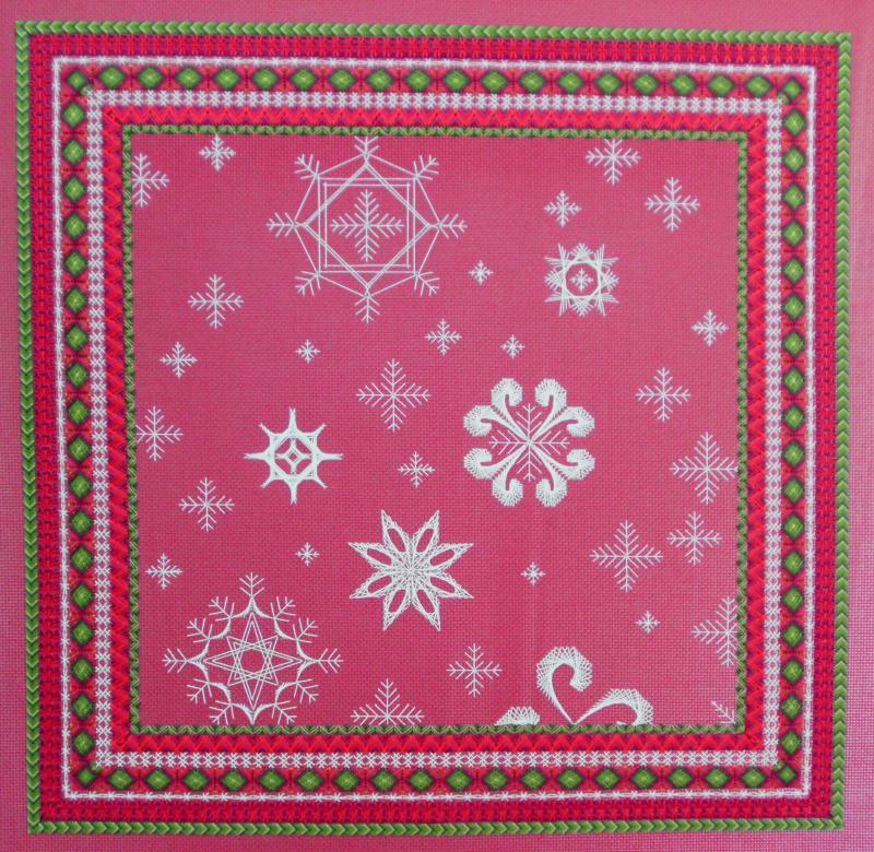 Christopher Ornament is a beautiful classic Christmas ornament design based on the antique glass Christmas ornaments of old. This one day intermediate level class on white congress cloth uses many different threads in a traditional red, gold, and green color scheme, including two types of metallic threads along with gold triangular beads. An interesting “Hot Foil Technique” will be applied before stitching begins. You will explore layered stitches and what happens when you reverse the order of stitching. Design Size 7" x 9". This is a 1-day class.