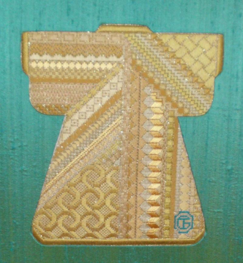 Royal Kimono is a beautiful sampler kimono. The many colors of gold thread, used together in this piece, weave a tapestry of gold. Using many different silks, linen, nylon, rayon, cotton, velvet, and one metallic thread, in the same color family, shows off the texture of the threads in the vertical, horizontal, and diagonal stripes, and in 2 overall design areas. The numerous stitches that you will learn in this sampler piece create a tapestry fabric for the kimono. The kimono is stitched on 18 count eggshell mono canvas and is at Intermediate Level.