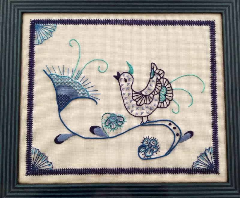 Songbird pays homage to part of our needleart history. In 1896, 2 women found some old damaged needlework in a museum near their small town of Deerfield, Massachusetts. The work was from the middle to late 1700’s and was brought to America by the colonists. The women set out to reproduce some of the work, their group became known as the Deerfield Society of Blue and White Needlework. Songbird utilizes some of the charming designs from the Deerfield Society with modern threads, i.e. Gloriana Silks, Soie Cristale silk, Planet Earth silks. Combining these beautiful silk threads with a touch of metallic brings these old whimsical designs to life. Laid filling patterns combine with classic embroidery stitches used at the time of the Deerfield Society to create a contemporary piece honoring our past. This intermediate level canvas embroidery design, on 24 ct. white Congress Cloth finishes to approximately 9” x 7”. This is a 2-day class.