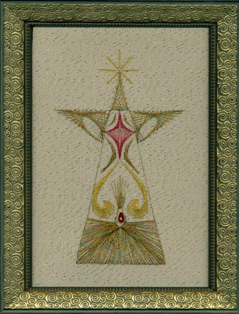 Twisted Angel is definitely a twist on the normal angel. She is composed of “Twisty Stitches” including Jessicas, Crescents, Amadeus, Chilly Hollow, and Sprats Head, using beautiful metallic threads and a tear drop bead. This intermediate level class on eggshell with gold metallic flecked Congress Cloth finishes to a 6” by 4” design and looks wonderful made into an ornament or a small framed piece. This is a 1-day class.