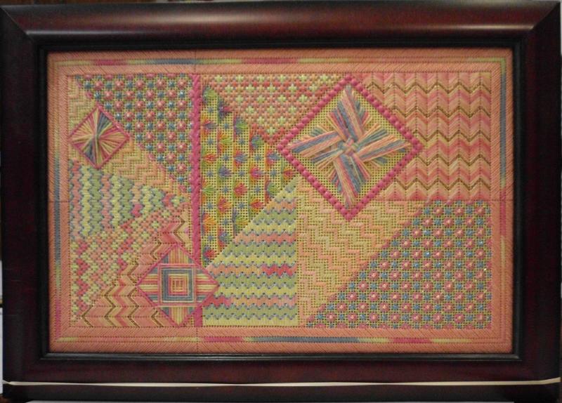 Carnival is a bright piece that makes you feel it’s a hot summer day and you are at the carnival. In this intermediate level class, you will learn several stitches beginning with the Jean Hilton “Kitty’s Double Fan Doubled” stitch, along with a Triangular Ray Eyelet, a Laid Filling stitch, and a bit of Florentine. After executing the stitches in one direction, your 18-ct. canvas is rotated 90˚’s to repeat the stitches on a smaller scale. An interesting effect occurs when you view the same stitches at a different angle. Design size: 10” x 6 1/2". This is a 2-day class.