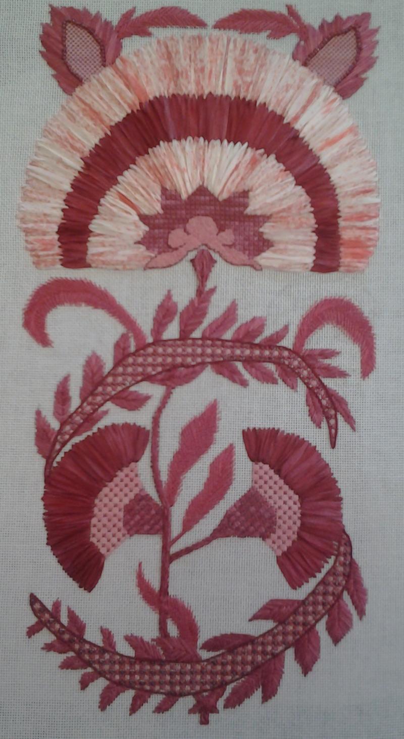 Fantasy Flowers is a beautiful art nouveau design based on a fireplace tile surround. This piece will be offered in 3 color choices; the original burgundy/rose combination, as well as, a blue colorway and a coral colorway. This intermediate level class on white congress cloth uses many different threads in a monochromatic color scheme, including several types of silks, metallics, cottons, & silk ribbons, along with petite glass beads. Design Size 7" x 12". This is a 2-day class.