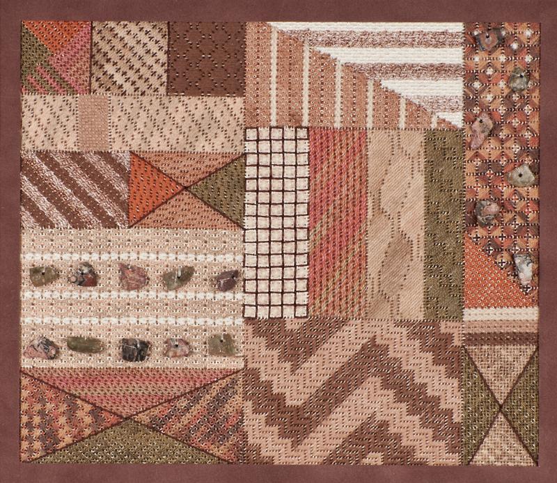 Jasper is a beautiful abstract non-symmetrical geometric design highlighting the colors of the earth, specifically the colors found in Leopardskin and Autumn Jasper stones and uses stitch variations to show striations of those stones.  The student will attach actual Jasper stone beads to the piece.  It is an intermediate level canvas embroidery class on eggshell Congress cloth using many different threads in terra cotta, browns, greens, creams, and tans, including silks, soy, wool, acrylic, cotton, and rayon threads.  Design Size:  7” x 6”. This is a 2-day class.
