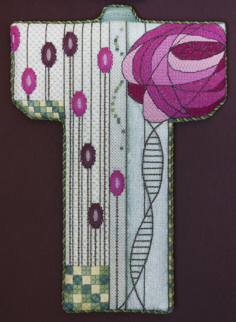 Mackintosh Rose Kimono Charles Rennie Mackintosh’s famous Rose design has been depicted many ways. Come join this class to create a beautiful Mackintosh Rose Kimono. The stained glass window motif will be fashioned by exploring several different techniques including stretching and couching Wire Lace, stitching on top of the first layer with a beautiful green/black shimmer metallic Sparkle Rays and Bijoux, and using stitches to create transparency. Using Planet Earth silks, Dinky-Dyes Hand dyed silks, Flair, Bijoux, Sparkle Rays, & more this intermediate level design will come to life on an 18ct. white mono canvas. Design size is 8 ¼” x 11 ½”. This is a 2-day class. Piece can be done as the original (above) kimono or as a rectangle.