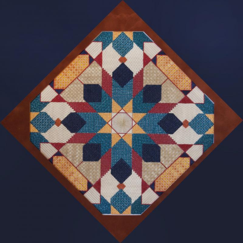 Moroccan Tile  Feel the warm sun and rich colors of the Moroccan desert while working on this rendition of a tile from the African land of Morocco. Learn many variations of laid filling stitches, Burden stitch & woven stitches using beautiful Silk Lamé Braids in 2 sizes and 3 colors, along with silks by Gumnuts, Soie Cristale, Planet Earth, Soie 100/3 and, Bijoux, threads. This intermediate level design finishes at approximately 12”x12” on white mono 18ct canvas. This is a 2-day class.
