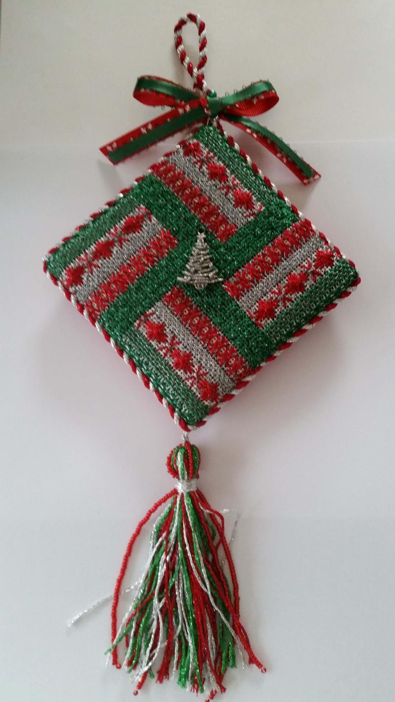 O Christmas Tree  Celebrate the wonder of the Christmas tree with this fanciful ornament featuring a special pewter Christmas tree attachment. The quadrants rotate around the tree and including star, Burden, Rhodes, & Waffle stitches among others. Using the new Rainbow Gallery thread, Entice along with Kreinik metallic makes this ornament shine for your own tree. This intermediate level class on white 18ct canvas finishes to a 4-inch square  and looks wonderful made into a diamond ornament with a tassel to finish it off. This is a 1/2 day or a 1-day class.