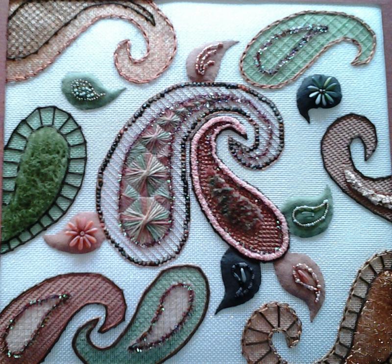 Texture as A Design Element, an all-level class, will show you how to add texture to your canvases.   After an informative visual presentation, students can choose to stitch small samples of all examples; or stitch a paisley design using the different techniques.   The kit will include all supplies, including many different types of thread, a 14” x 14”, 18 ct. white-opalescent mono canvas, and Ultrasuede™.  This is a 2-day class.
