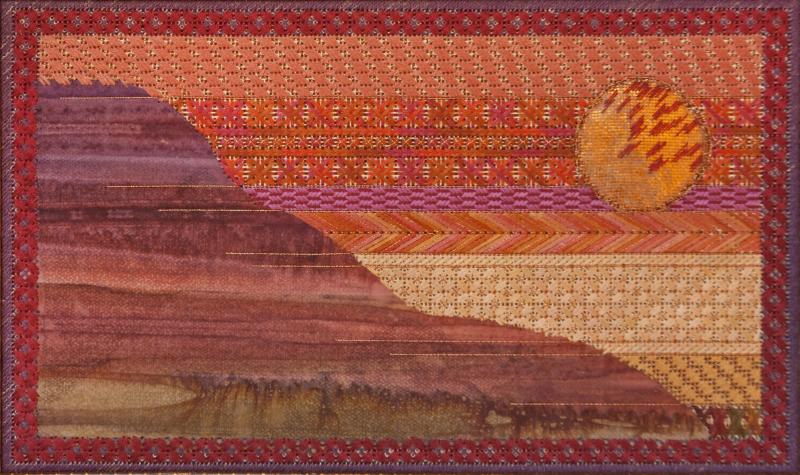Under a Copper Moon During a total lunar eclipse the moon can turn a deep red, sometimes called a “blood moon” or a “copper moon”. For most of human history the moon was a huge mystery and when a copper moon occurs it still casts a spooky spell over the land. This design creates a band sampler of the varying colors of the landscape in the mountains during a lunar eclipse. Starting with the fabric mountain appliqué, and the hot foil technique to create the first layer of the copper moon with real metallic copper foil applied to a small piece of congress cloth which is then appliqued to the canvas, and finishing with the woven cross stitch border you will learn many stitches to form bands of color in the night sky. Over stitching on the copper metallic lends an eerie feel to the copper moon in this intermediate level design on 18ct mono sandstone canvas. Design size is approximately 11”x 6”. This can be taught as a 2-day or a 3-day class.